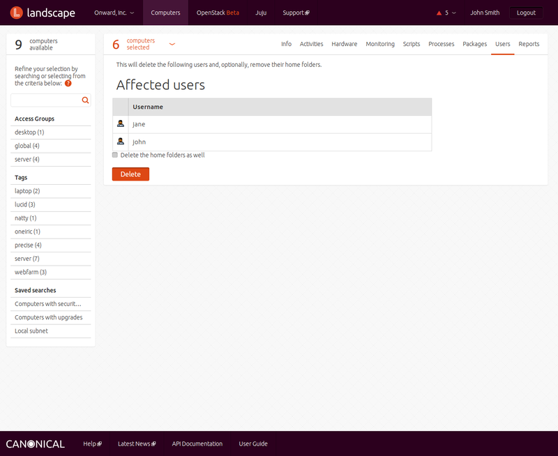 You may also tick a checkbox to delete the user's home folders as well. Press the button at the bottom of the screen to complete the operation.The button displays a User details screen that lets you change details such as the person's name, primary group, passphrase, location, and telephone numbers, and add or remove the user from groups on the selected computers.