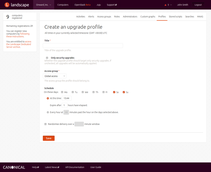 An upgrade profile defines a schedule for the times when upgrades are to be automatically installed on the machines associated with a specific access group. You can associate zero or more computers with each upgrade profile via tags to install packages on those computers. You can also associate an upgrade profile with an access group, which limits its use to only computers within the specified access group. You can manage upgrade profiles from the UPGRADE PROFILES link in the choice under your account.